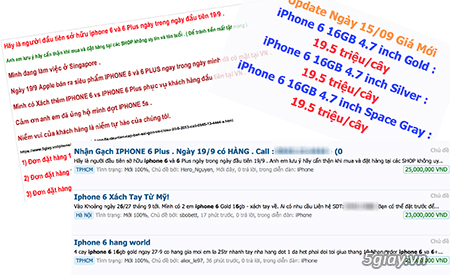 Sau khi Apple ra mắt bộ đôi điện thoại iPhone 6, iPhone 6 Plus, hàng loạt các cửa hàng nhỏ lẻ đã ngay lập tức tung ra nhiều chương trình đặt hàng sớm. Tuy nhiên, mức giá đặt hàng sớm được đội lên đến 30 triệu đồng mà người dùng Việt vẫn không nao núng khi rút hầu bao.Nhiều cửa hàng đã cho đặt hàng iPhone 6 và nhận hàng từ ngày 19/9